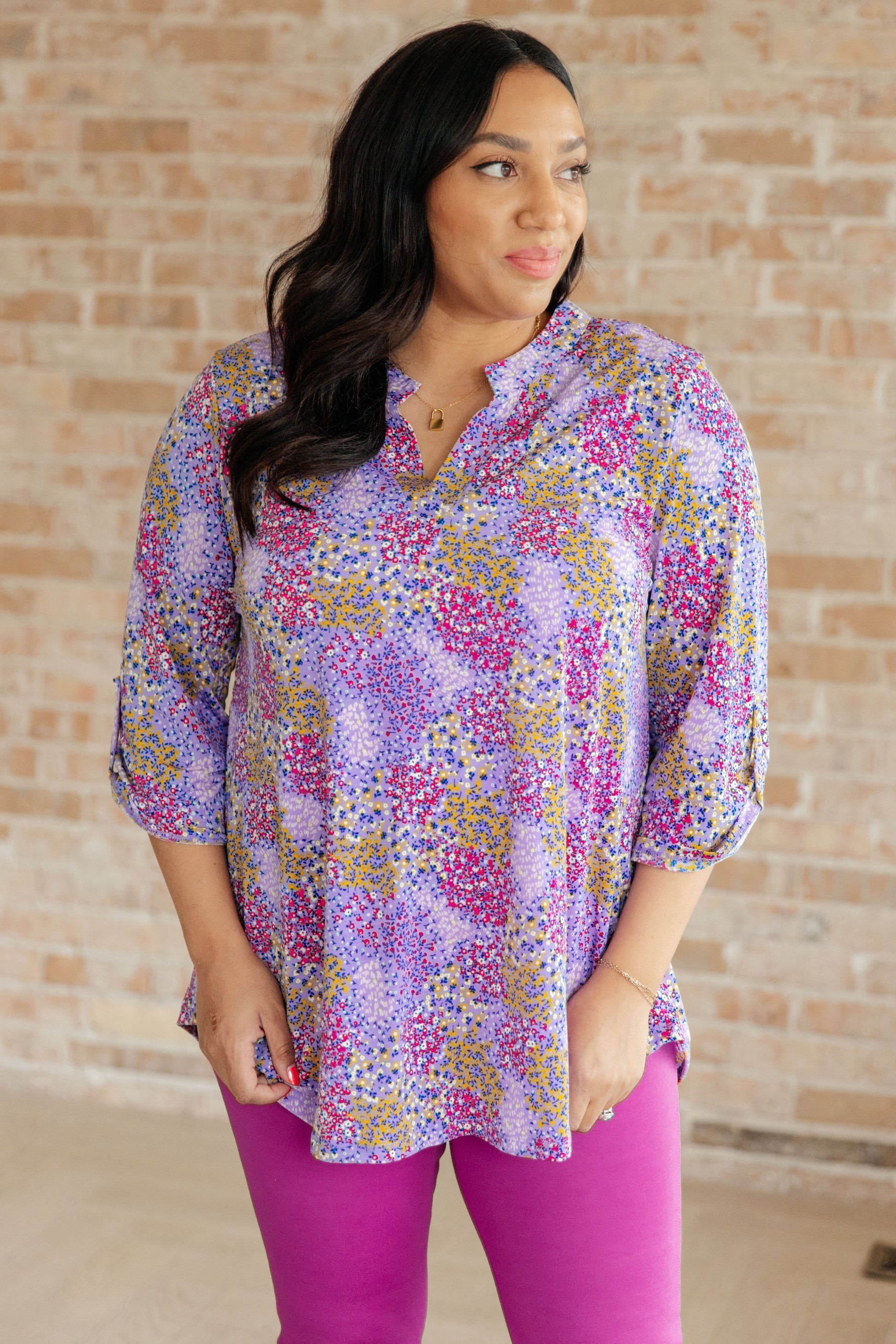 Transform your closet with the Lizzy Top in Lavender Ditsy Floral. Made from Bulgari, this top features a gabby neckline and button rolled sleeve tabs for a comfortable, yet eye-turning piece. The 3/4 sleeve and scoop hem add flow to the already stylish piece. Experience comfort and style in one with the Lizzy Top.