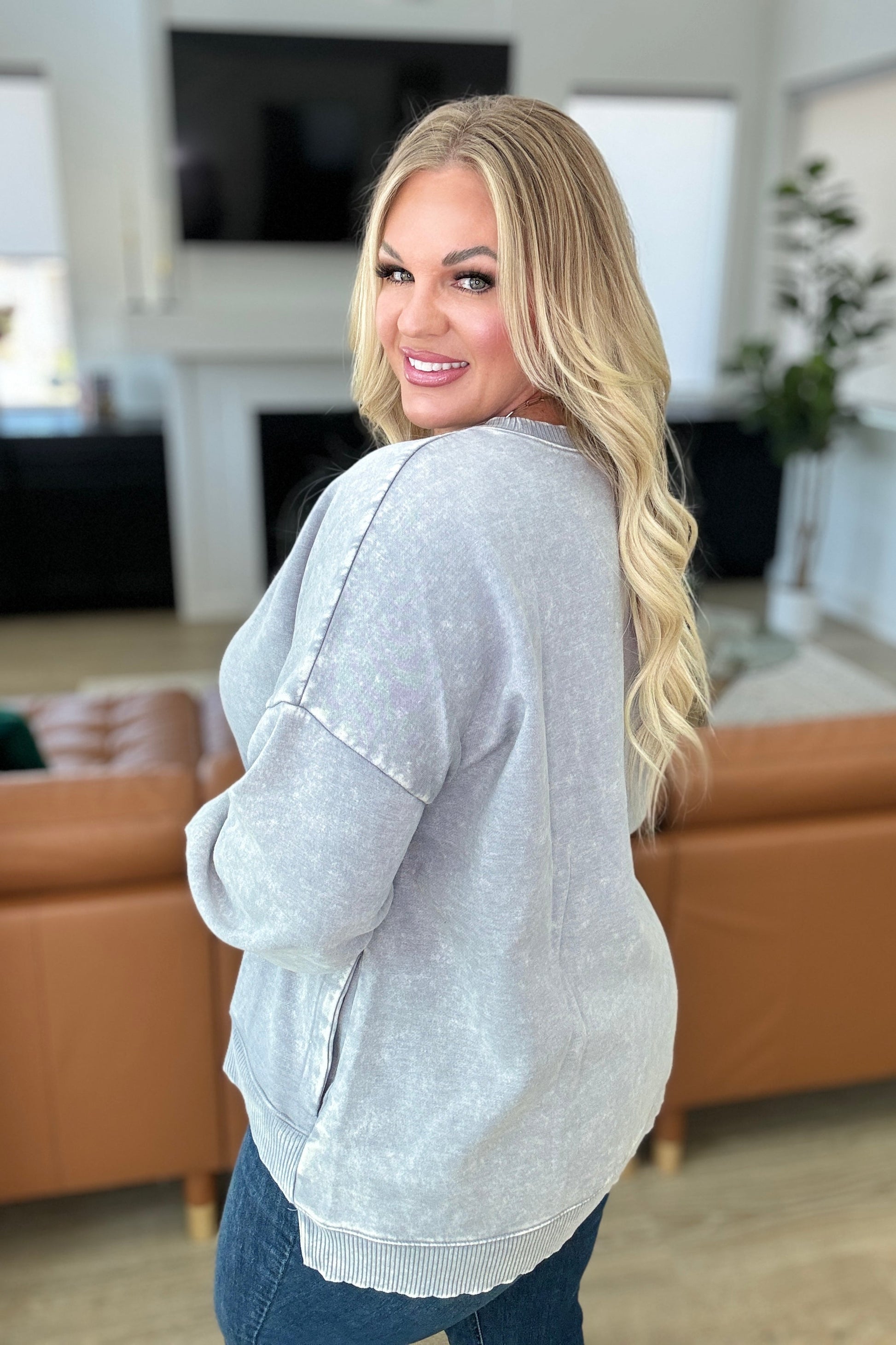Elevate your casual style with our Mineral Wash Step Hem Sweatshirt! Made from soft fleece, it features a banded ribbed neckline and drop shoulder for a relaxed fit. The stepped hemline and functional side pockets add utility and style. Try it in Sleet for a timeless look.