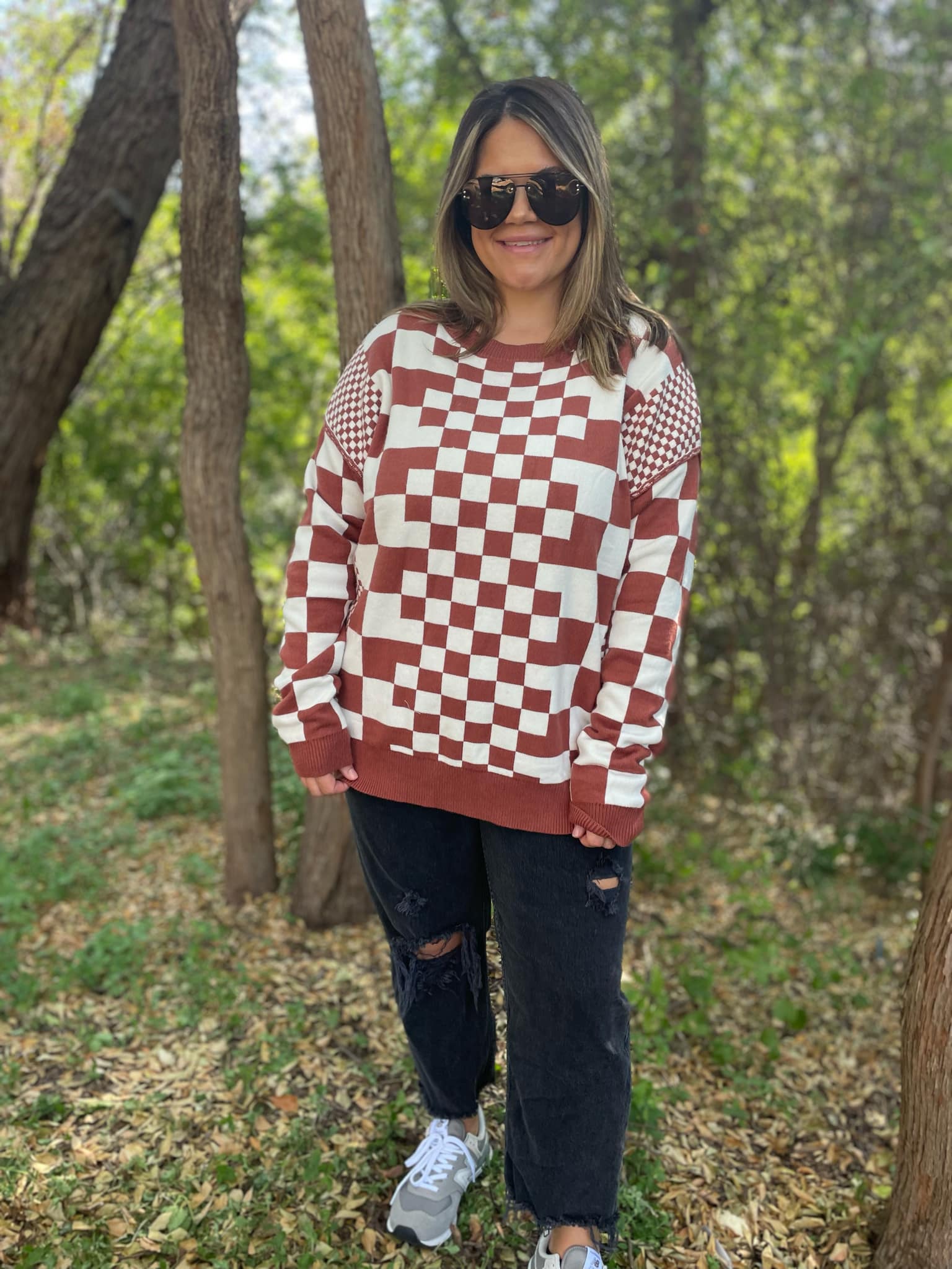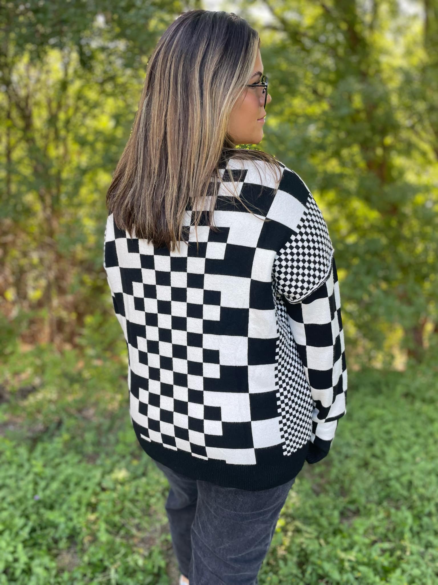 Trust us when we say this is THE SWEATER you need in your closet this year! The high quality fabric is heavenly -- soft and luxurious with plenty of stretch. The contrasting sized checkers add such a fun detail and all four colors are absolutely gorgeous!