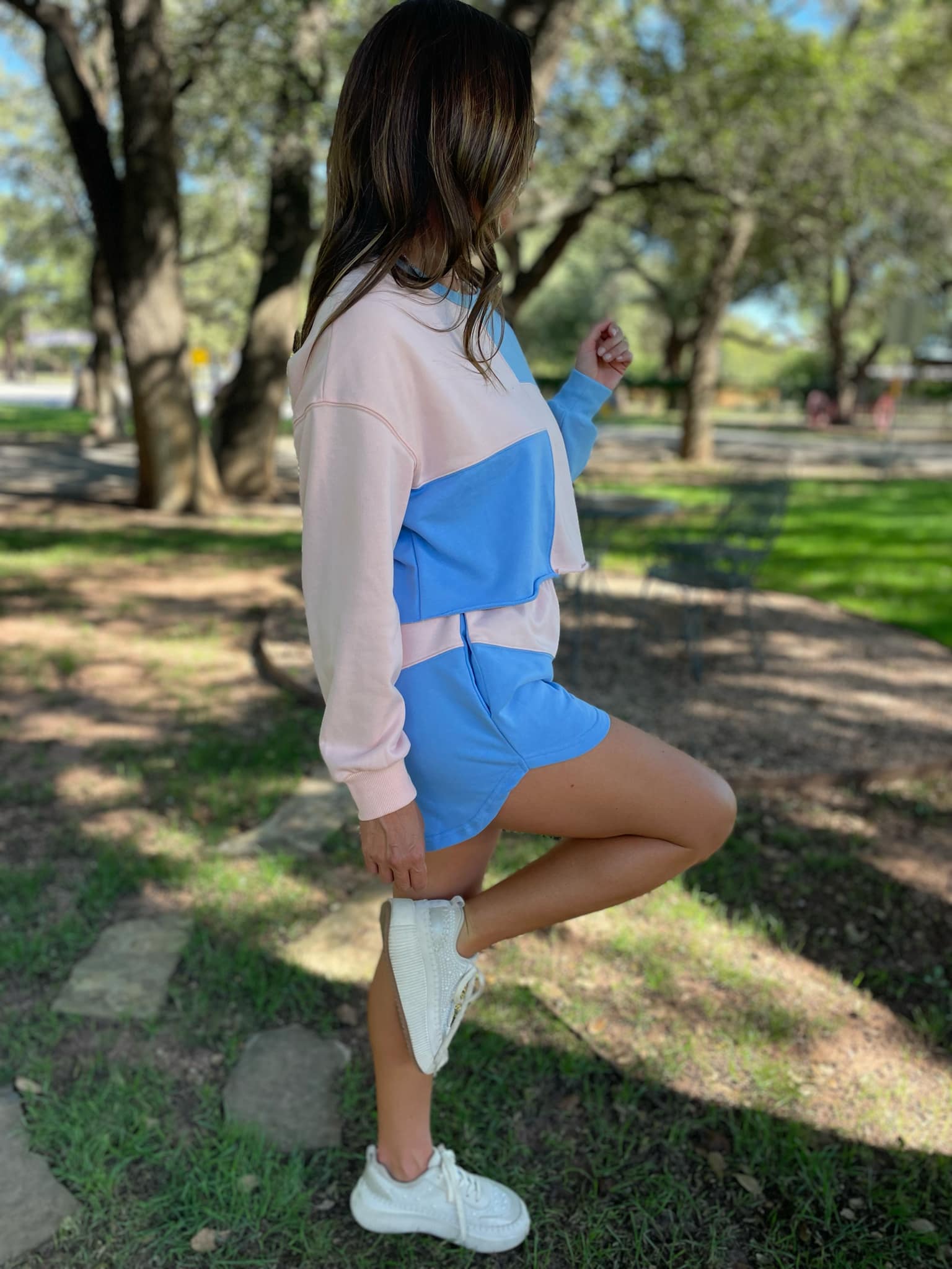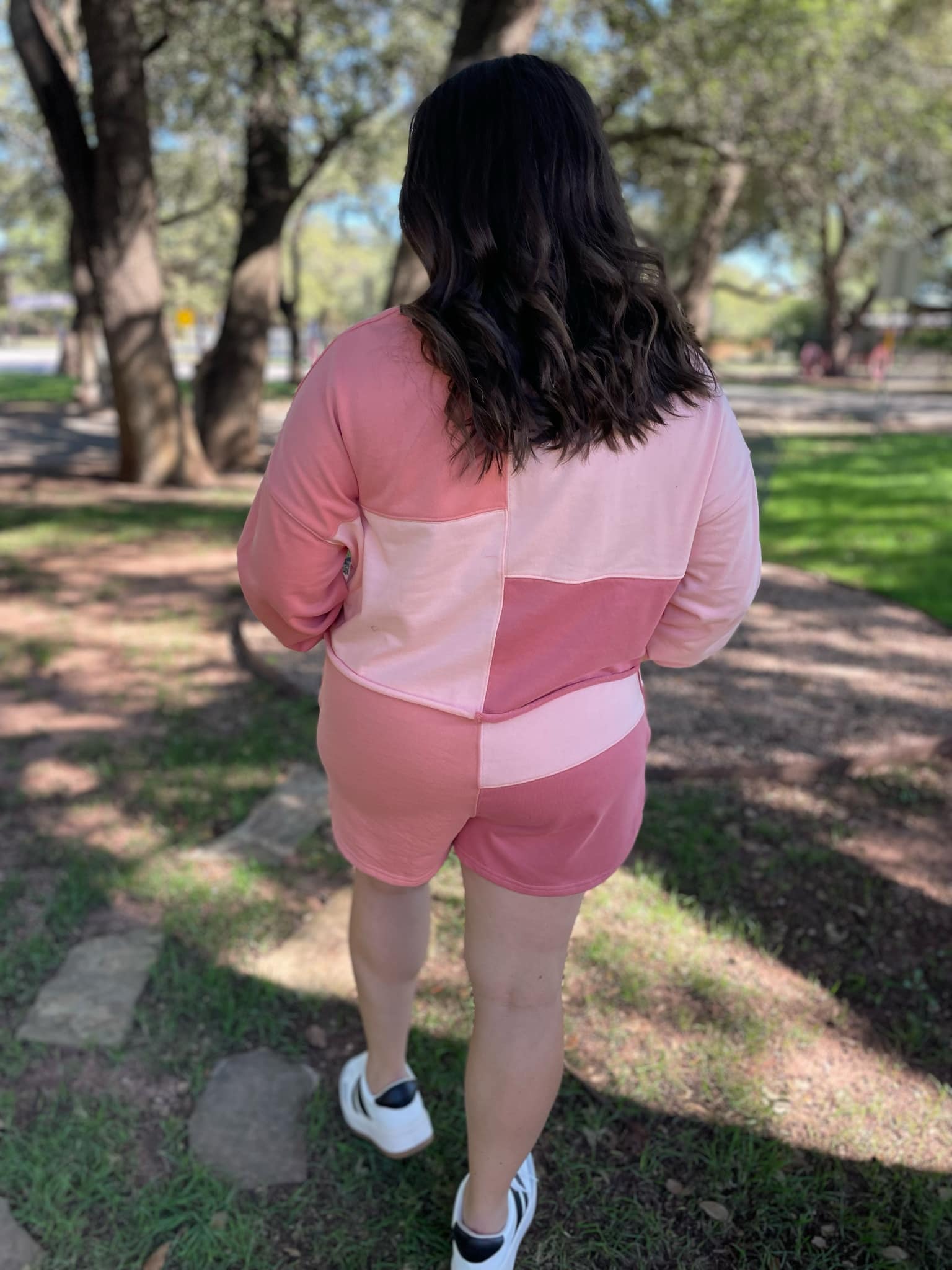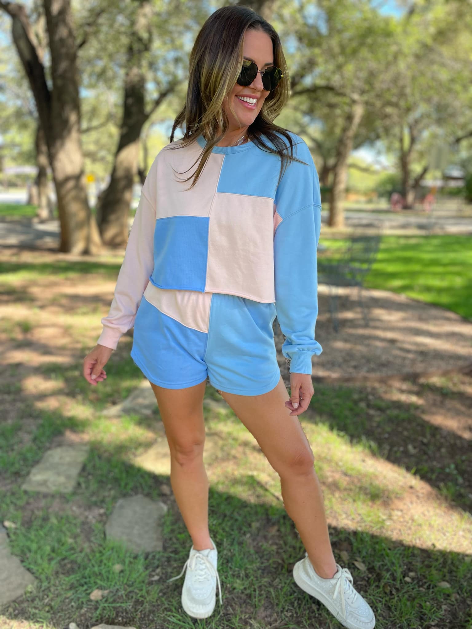 This french terry lounge set is available in two color options to keep you looking cute and cozy at home or on the go. The top is a trendy, slightly cropped length and the shorts have a elastic waistband with pockets! Wear these coordinating pieces as a set or individually with other items in your closet.