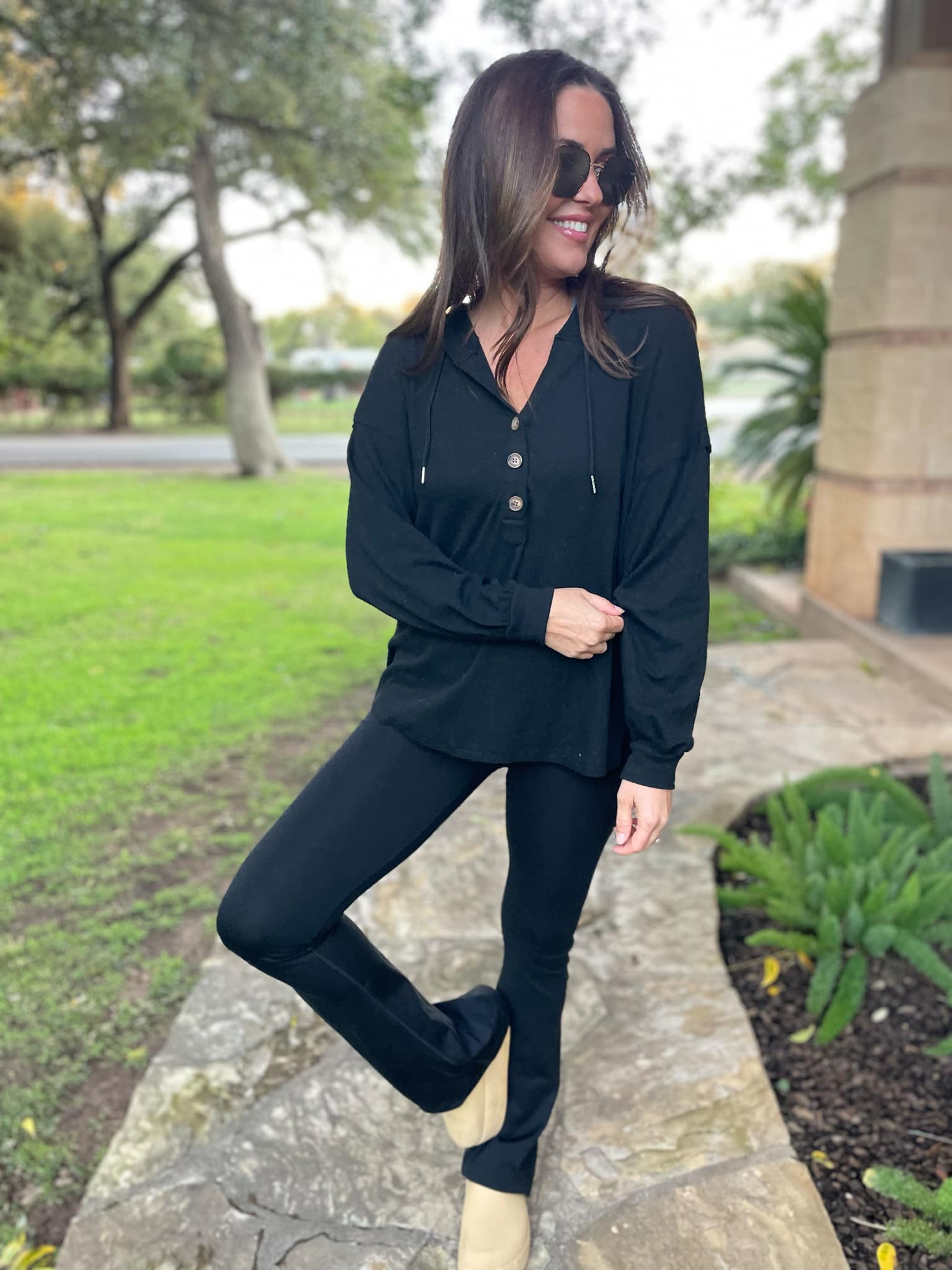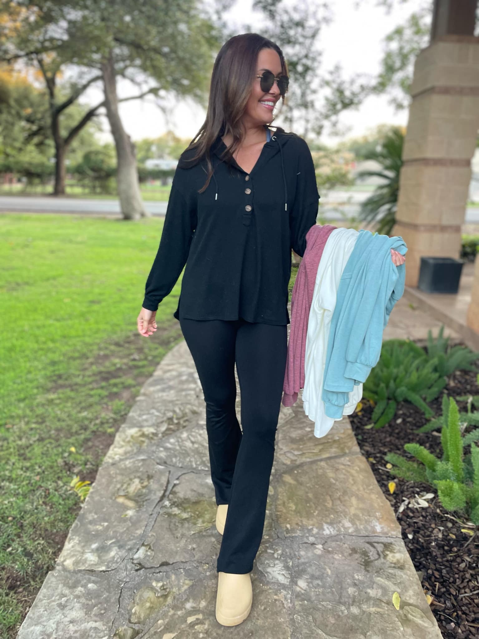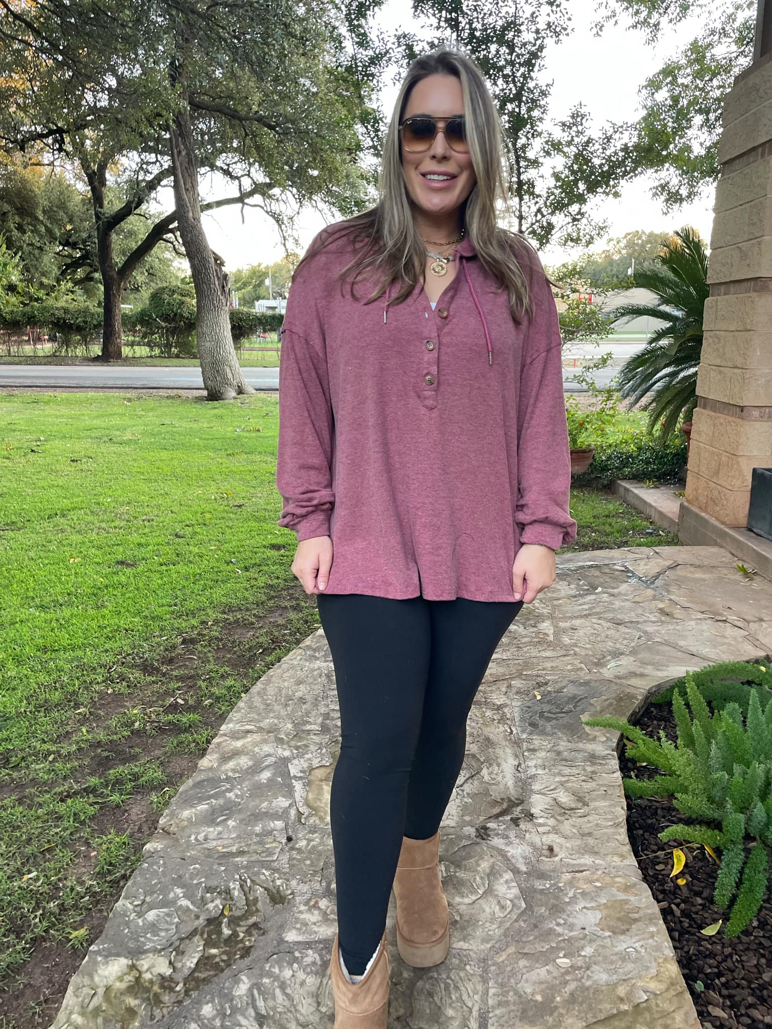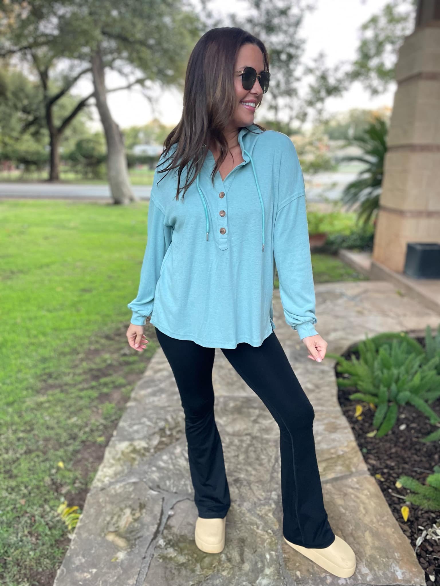 This lightweight pullover is soft and comfy! Featuring a drawstring hood, tortoise shell buttons and side slits. Available in four colors!