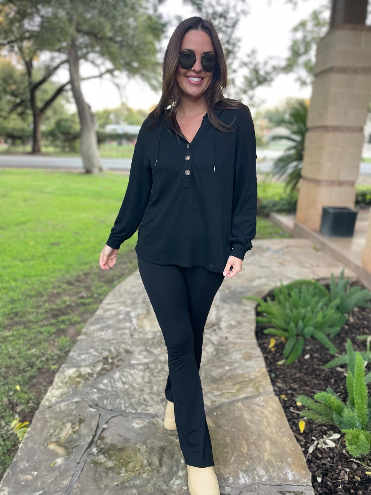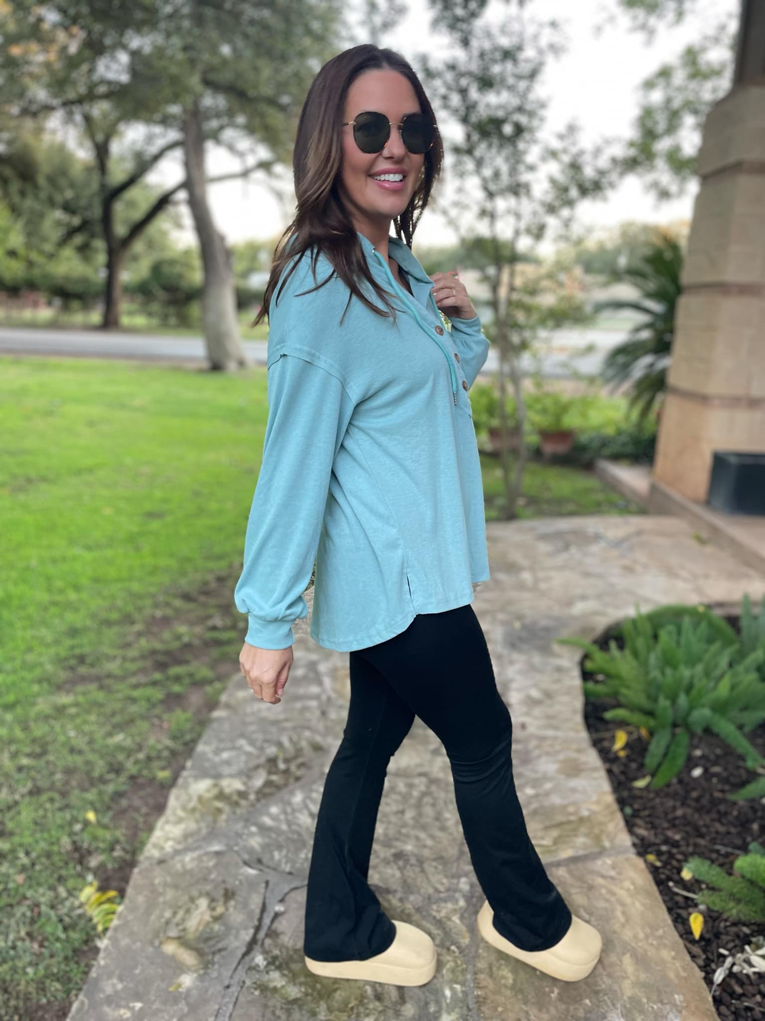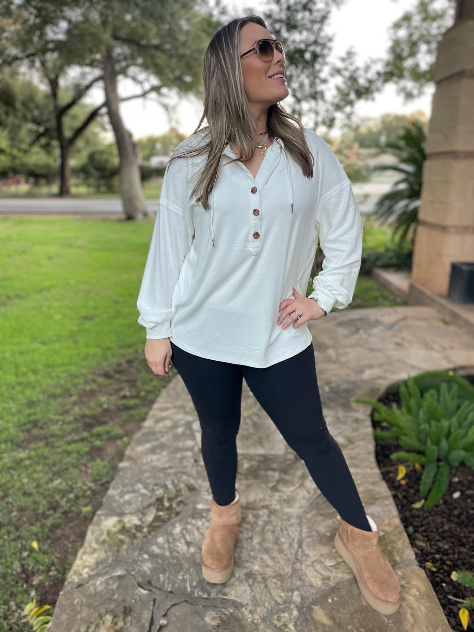 This lightweight pullover is soft and comfy! Featuring a drawstring hood, tortoise shell buttons and side slits. Available in four colors!