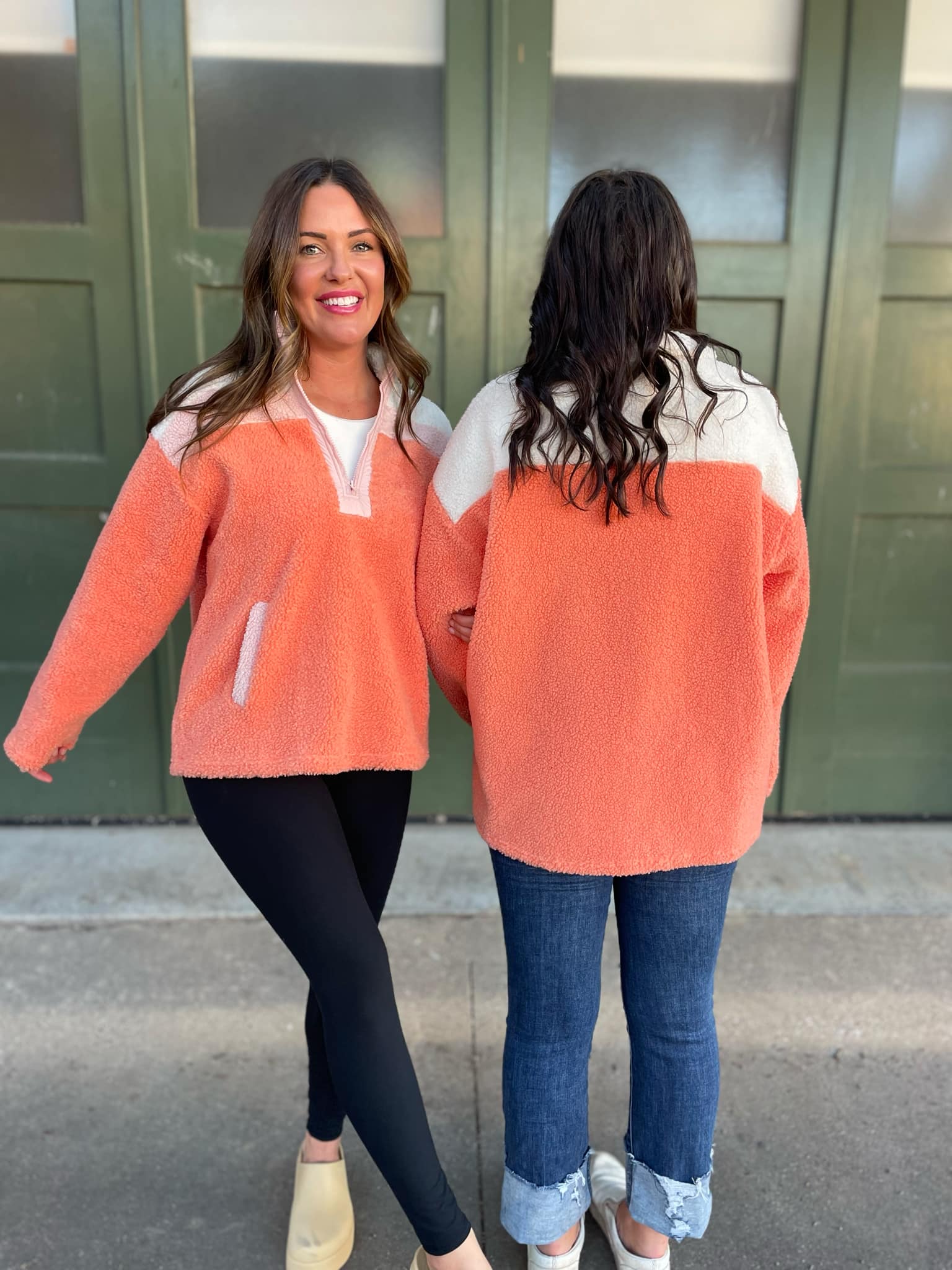 This sherpa fleece has the most beautiful combination of colors. Soft and cozy with pockets and a half zip detail - it's easy to wear but still a fun statement piece!