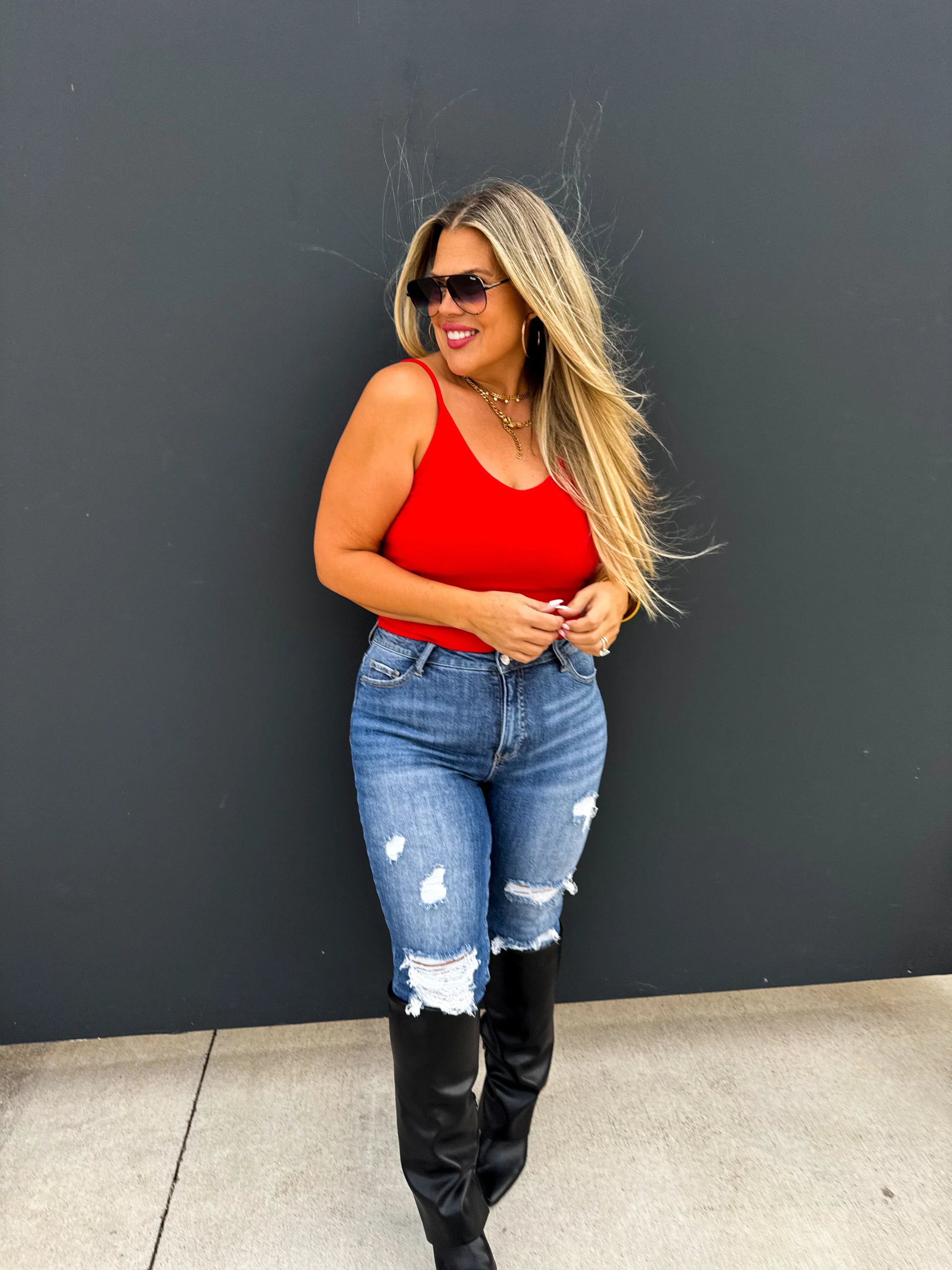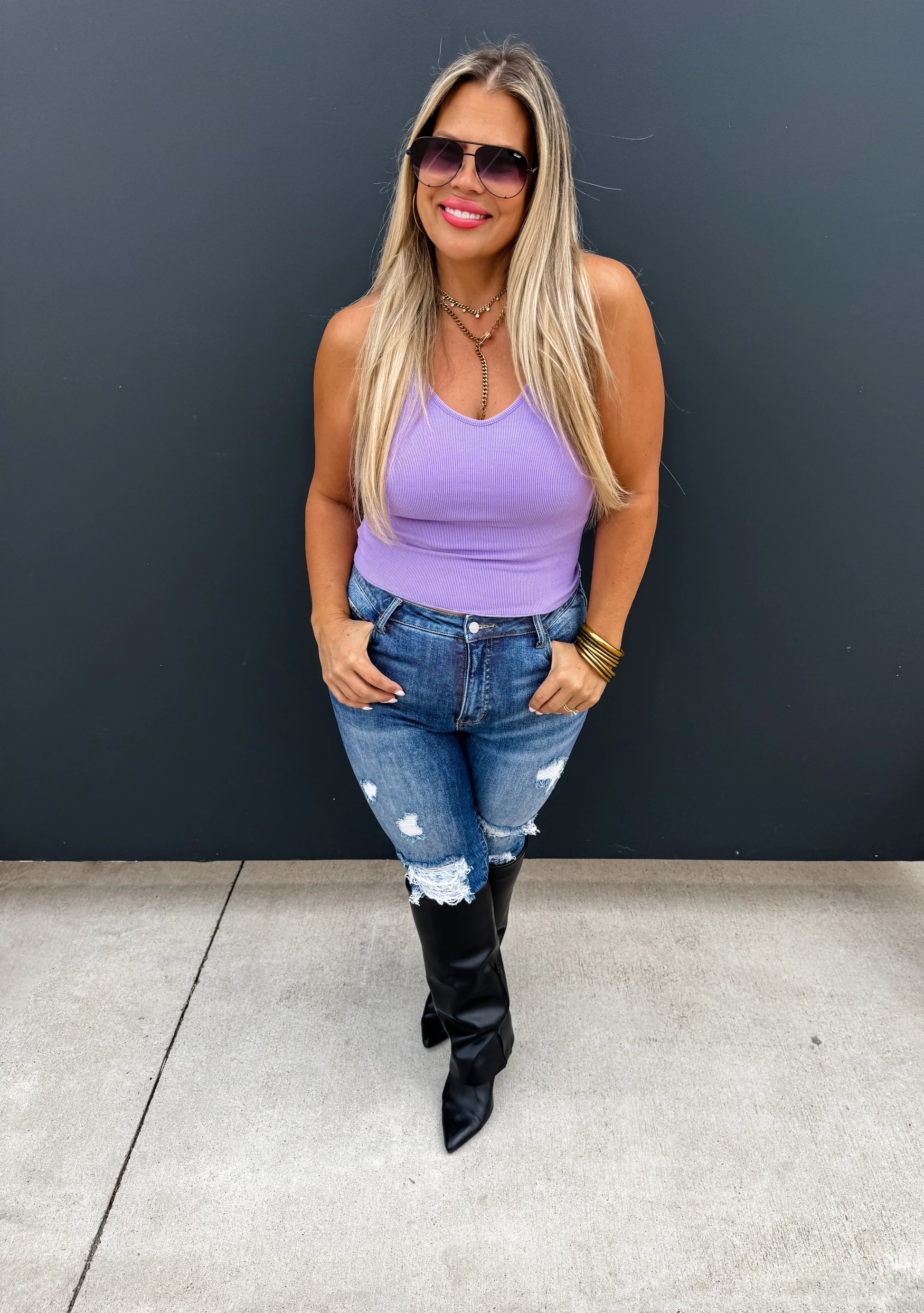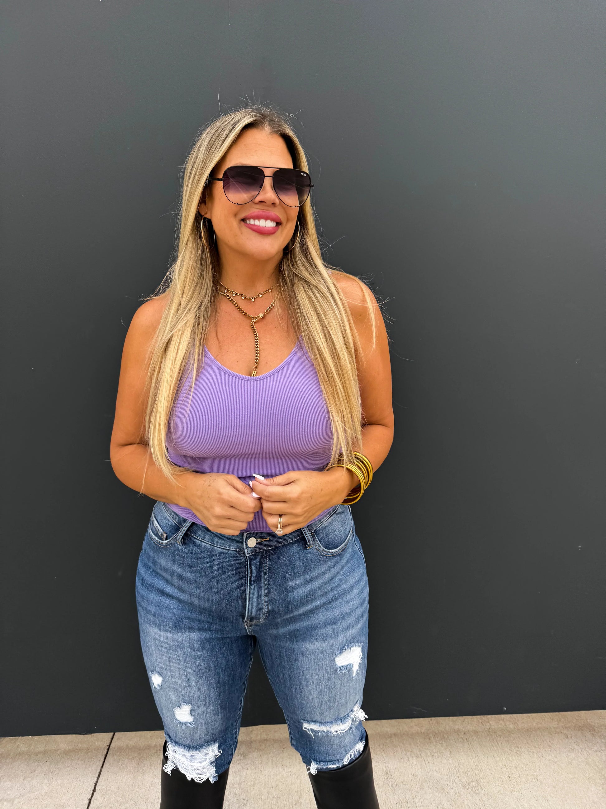 Our new tanks are here and crafted in soft, stretchy ribbed material. This cute tank features a flattering neckline with a lettuce trim detail and adjustable straps. Perfect for layering or wearing on its own.