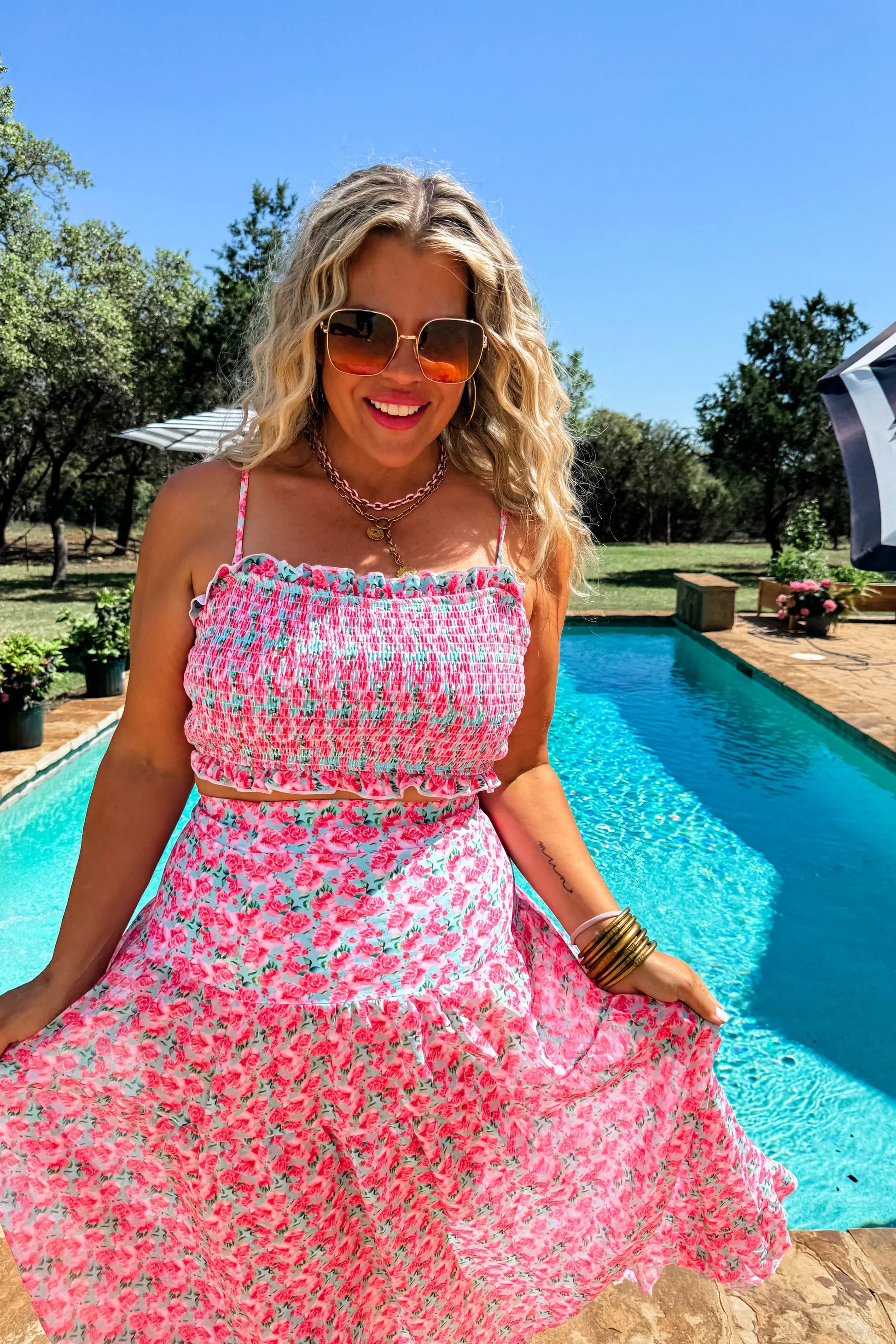 TOP: Perfect stomach coverage and comfort, this completely smocked top features a padded lined bra, removable straps, and the cutest ruffle trim!