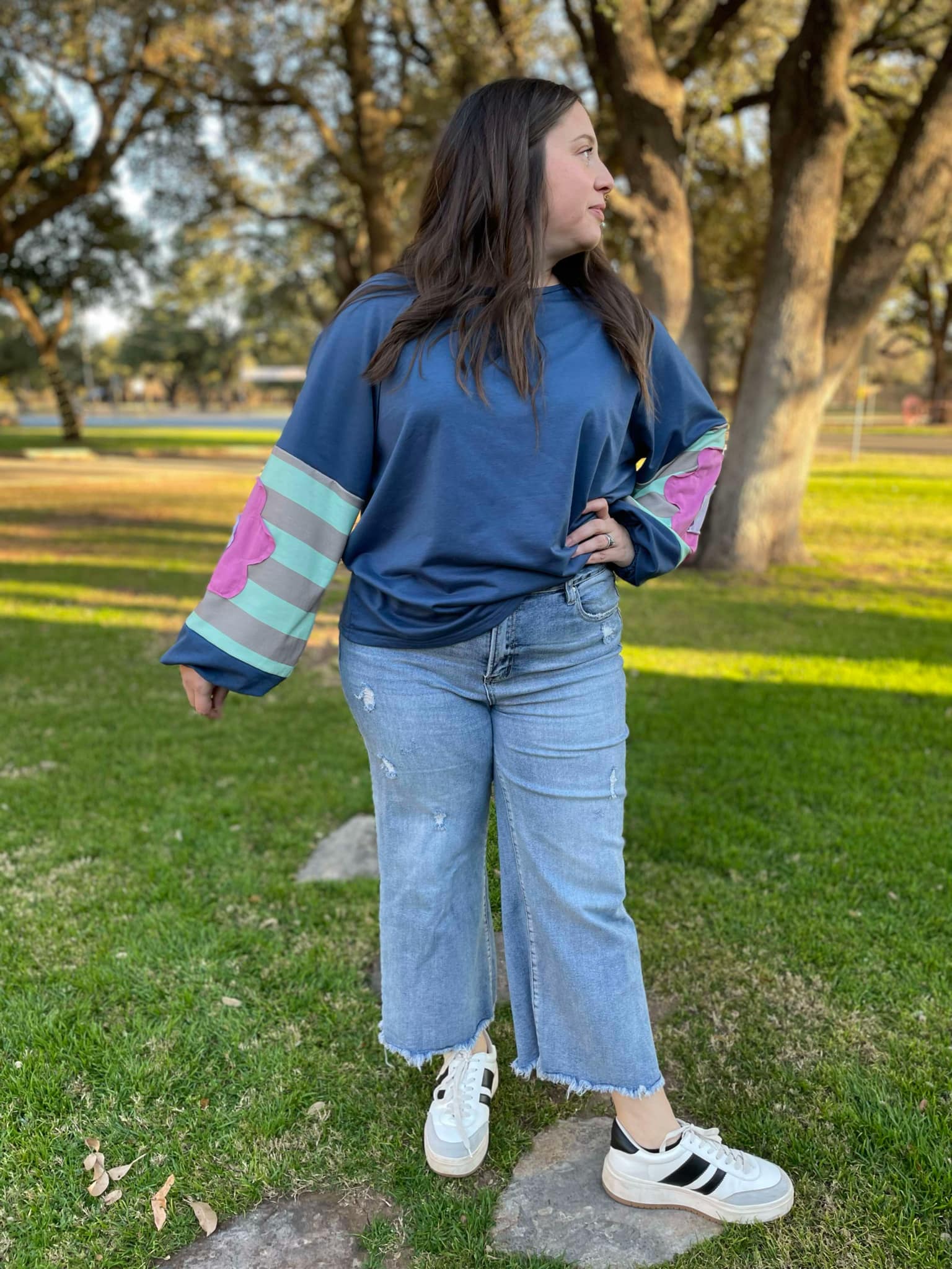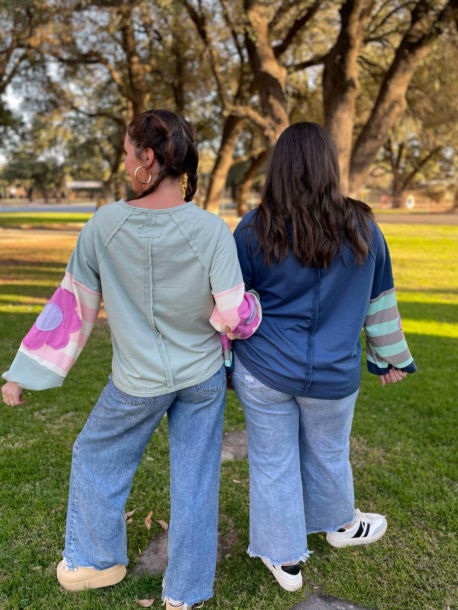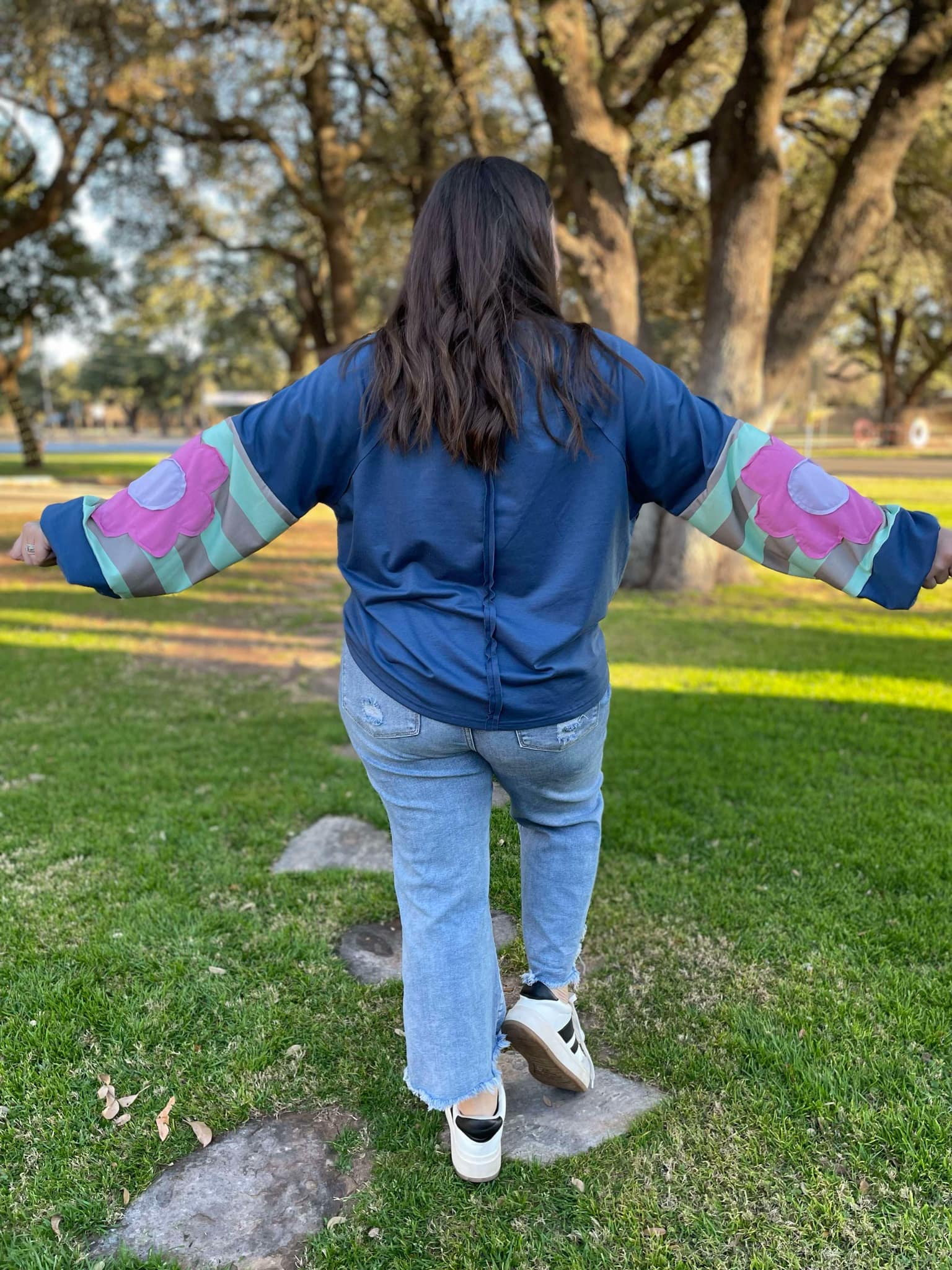 Upgrade your wardrobe with our New and Improved Floral Patchwork Top! Made with soft French terry fabric, this top features a round neckline and unique dolman balloon sleeves with cased elastic cuffs. The raw edge details add a touch of edginess to this playful and versatile piece.
