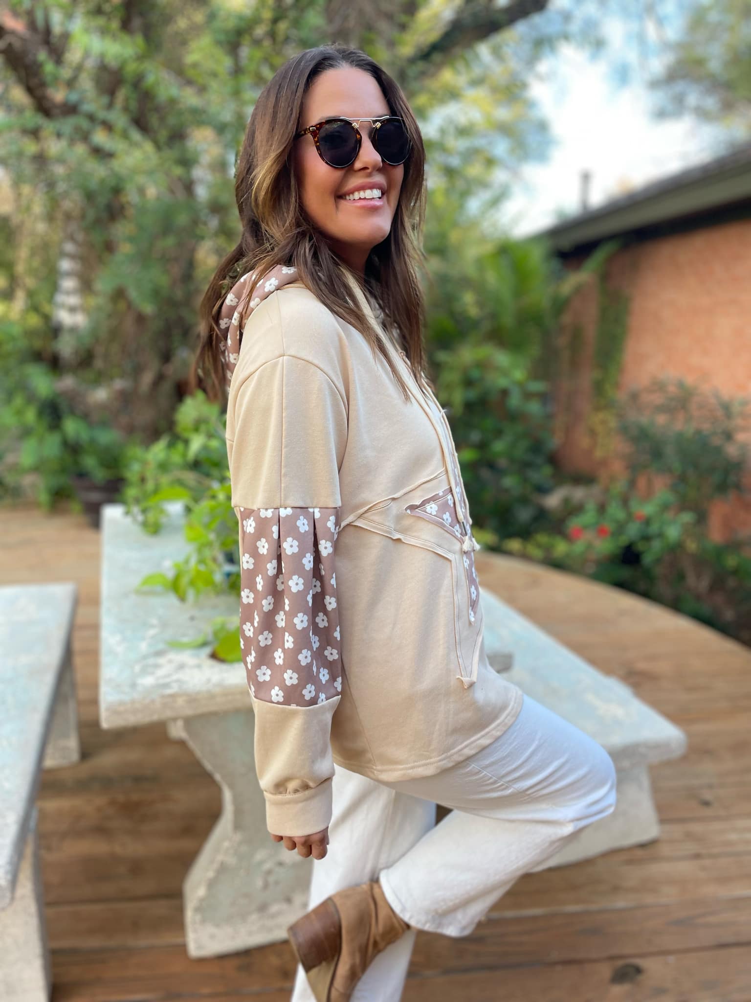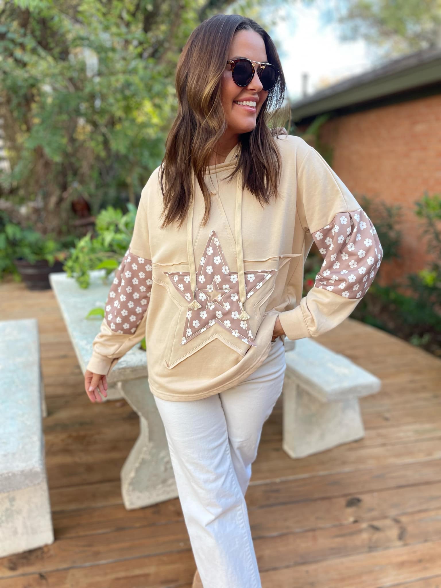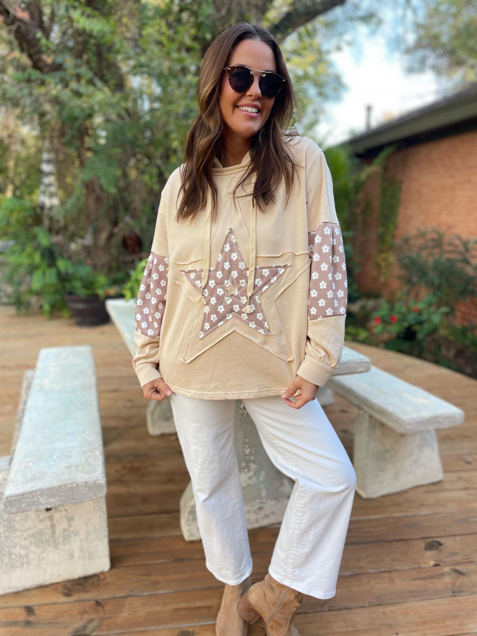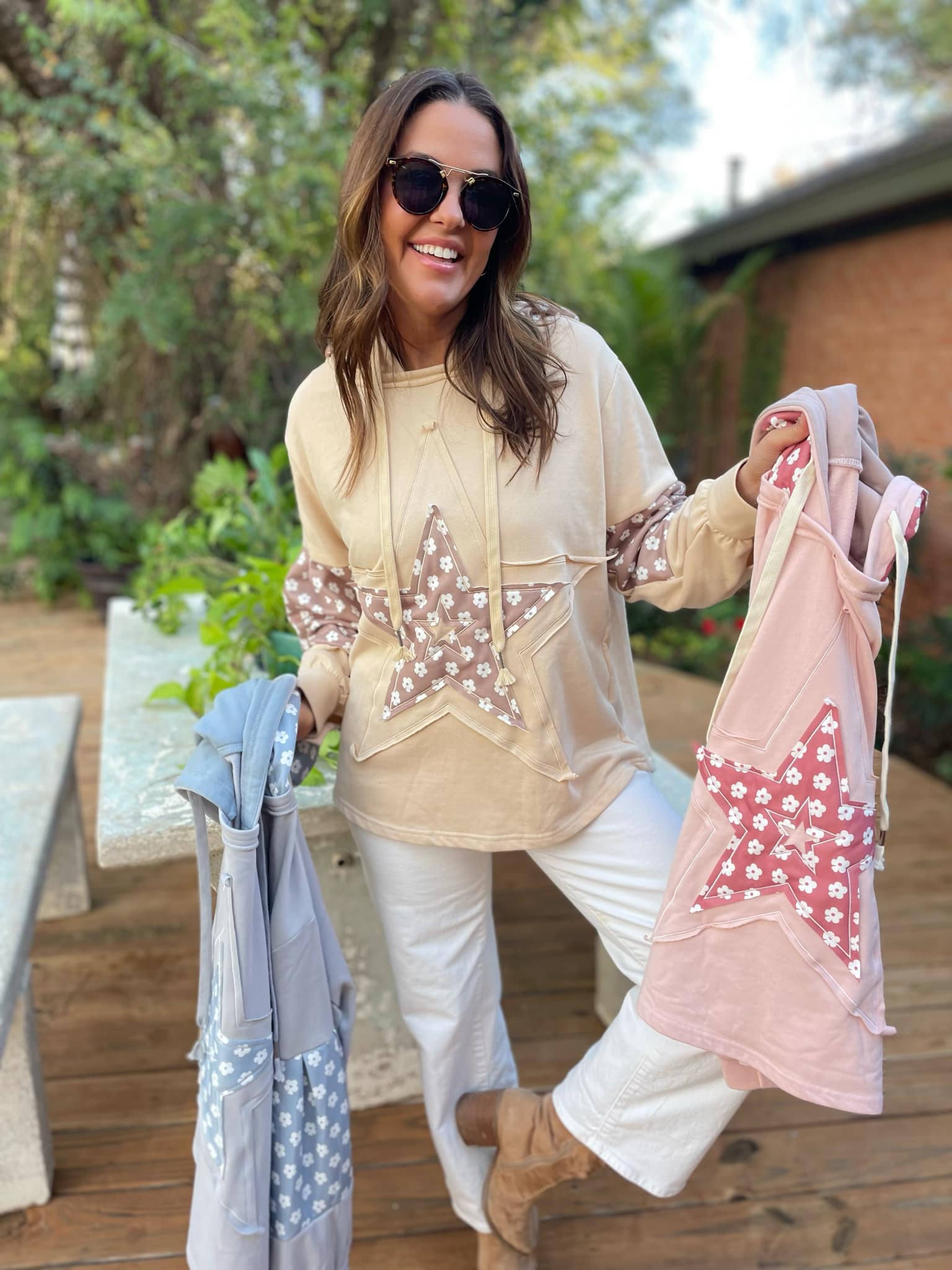 This cozy relaxed fit hoodie is giving us springtime vibes. Featuring a floral and star patchwork design, hood with functional drawstrings and button cuffs. Available in three colors!