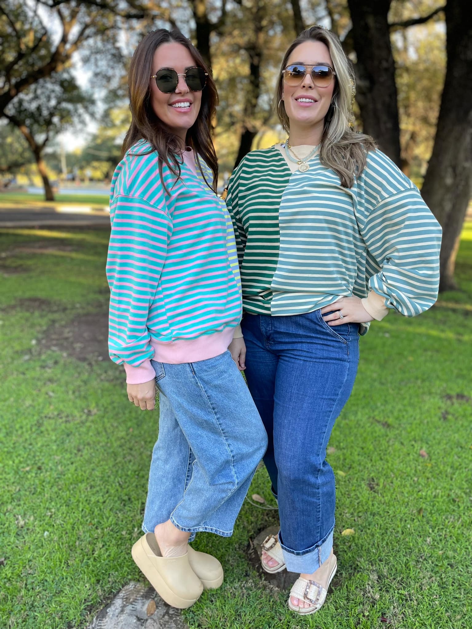 This color block sweatshirt is fun and functional! With a stripe pattern and contrasting trim, this soft sweatshirt features a drop sleeve and relaxed fit for maximum comfort! Available in four colors.