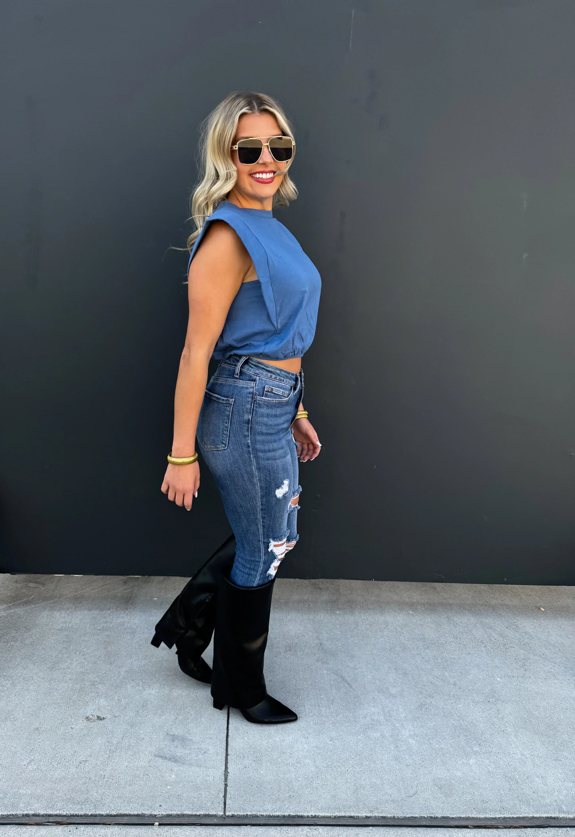 The cutest little crop style top! Flattering cap sleeve with an elastic band waist. Looks adorable worn with a pair of our high rise jeans!