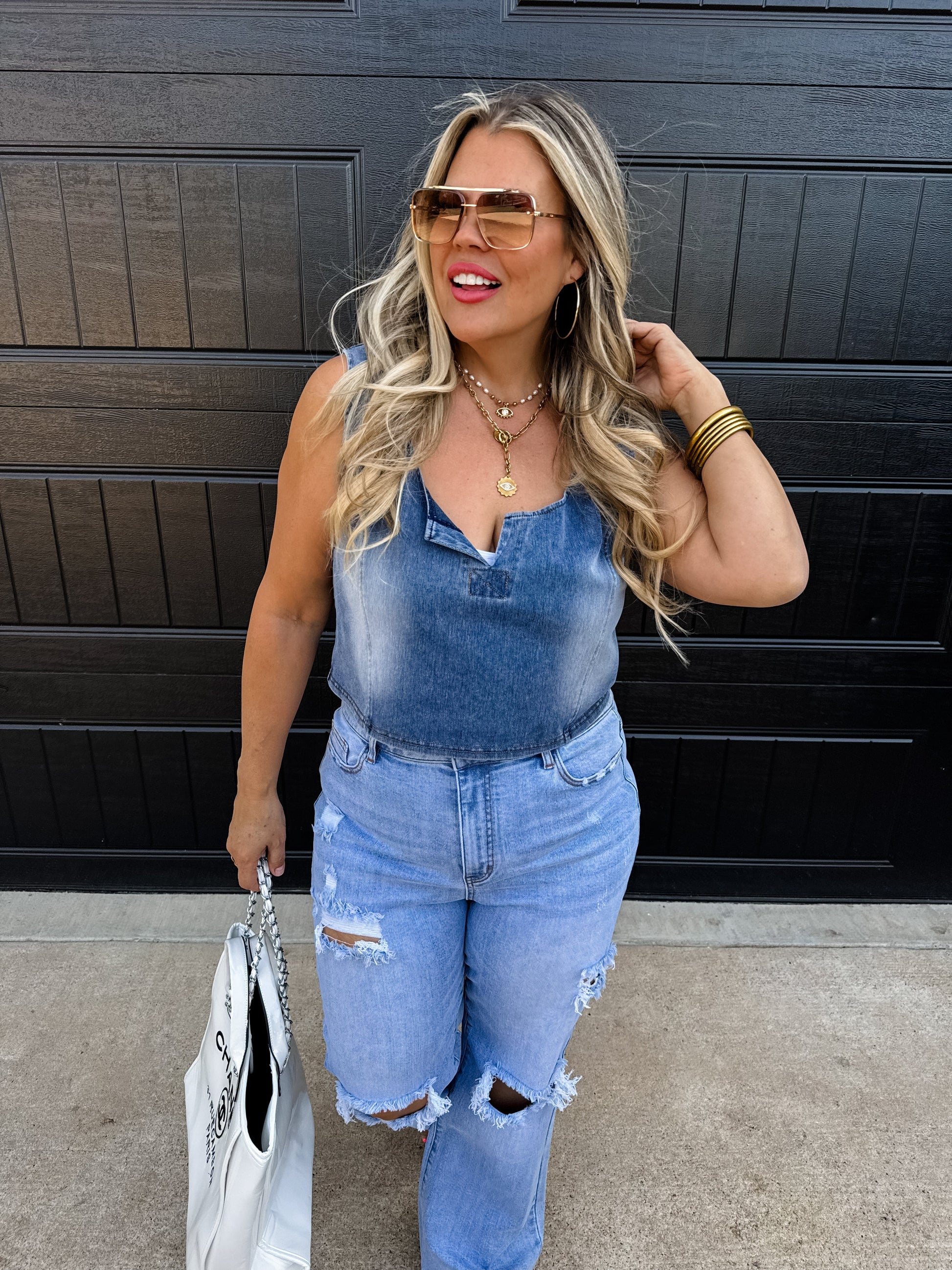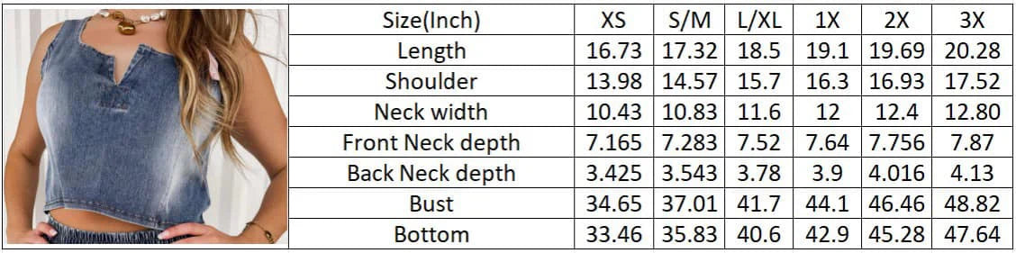 Designed with a flattering faded wash, this sleeveless tank is a crop style, yet not too short. The notched neckline adds a unique touch. Whether paired with matching our matching “Drift Away Denim shorts” for a trendy set or tucked into high-waisted jeans, this tank is a must-have for any denim lover.