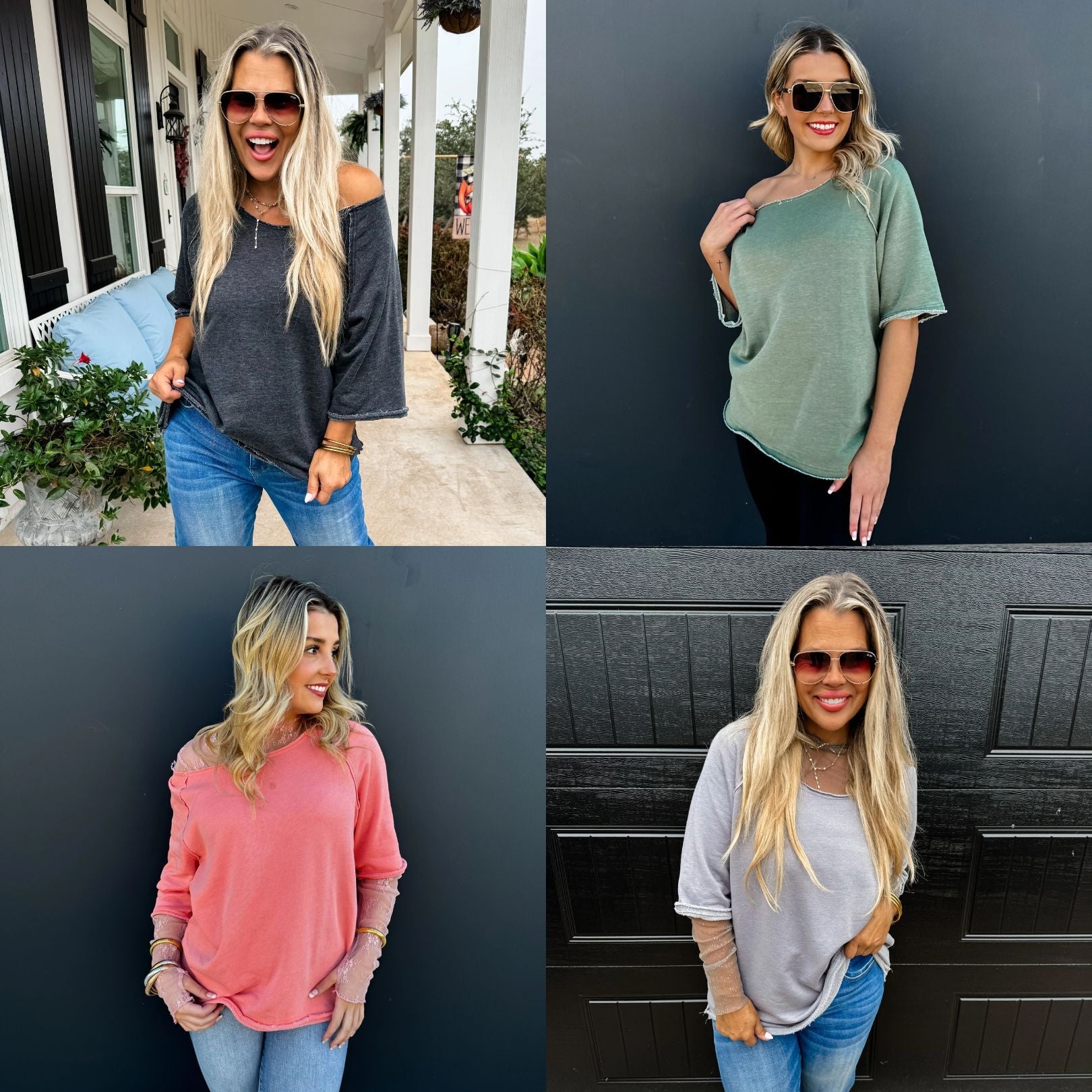 We spared no attention to detail in our everyday sweatshirt! This pullover is a slouchy, relaxed fit with reverse hem details, wide boatneck to wear on/off shoulder and raw hem lines! Has super soft "sweatshirt" feel on the inside!