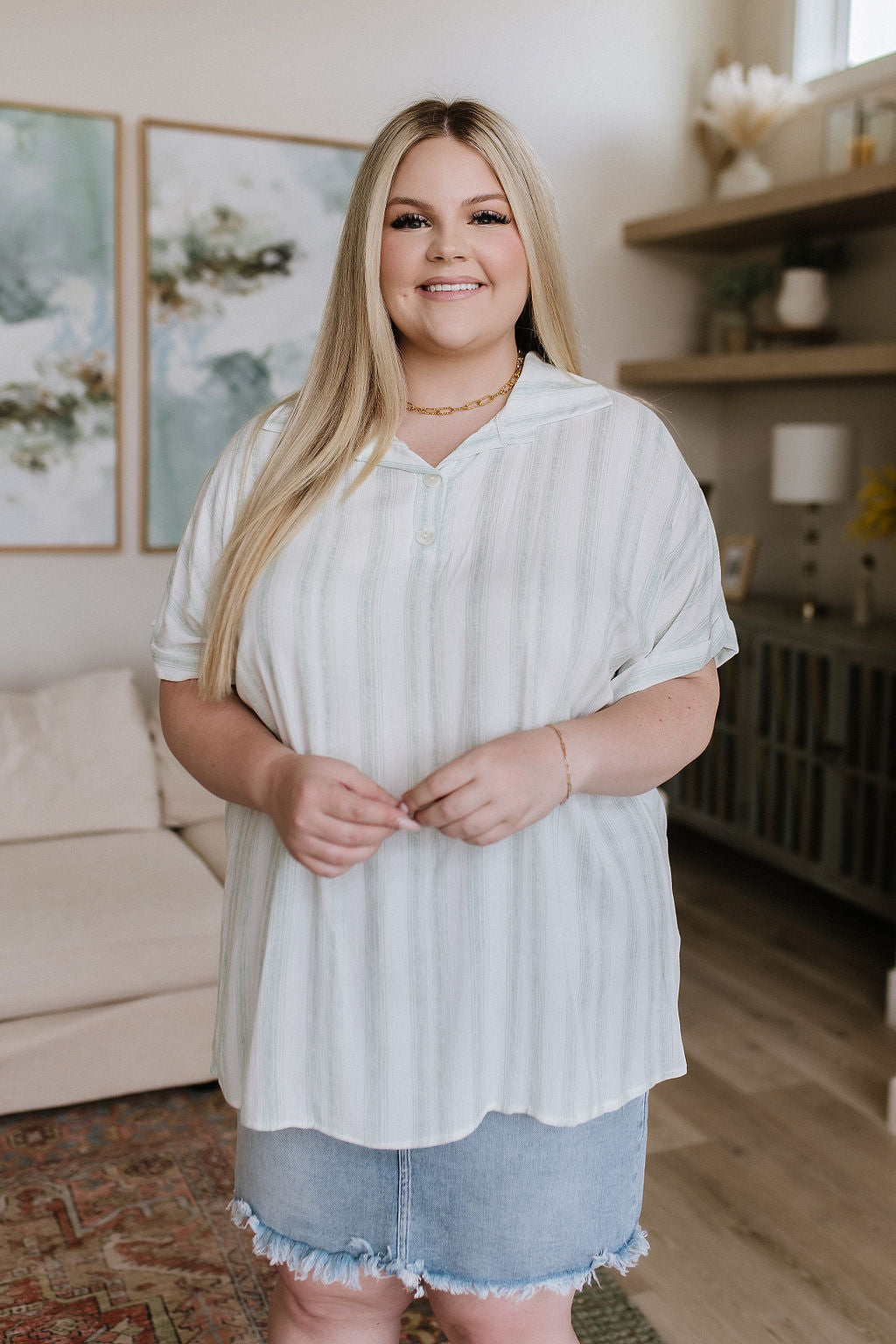 Be effortlessly stylish with the So Far Away Striped Top! Featuring a classic faux button neckline, fold over collar, cuffed dolman sleeves, and a gathered back seam for a comfortable fit. The casual stripes complete the look for an effortless, yet sophisticated style!
