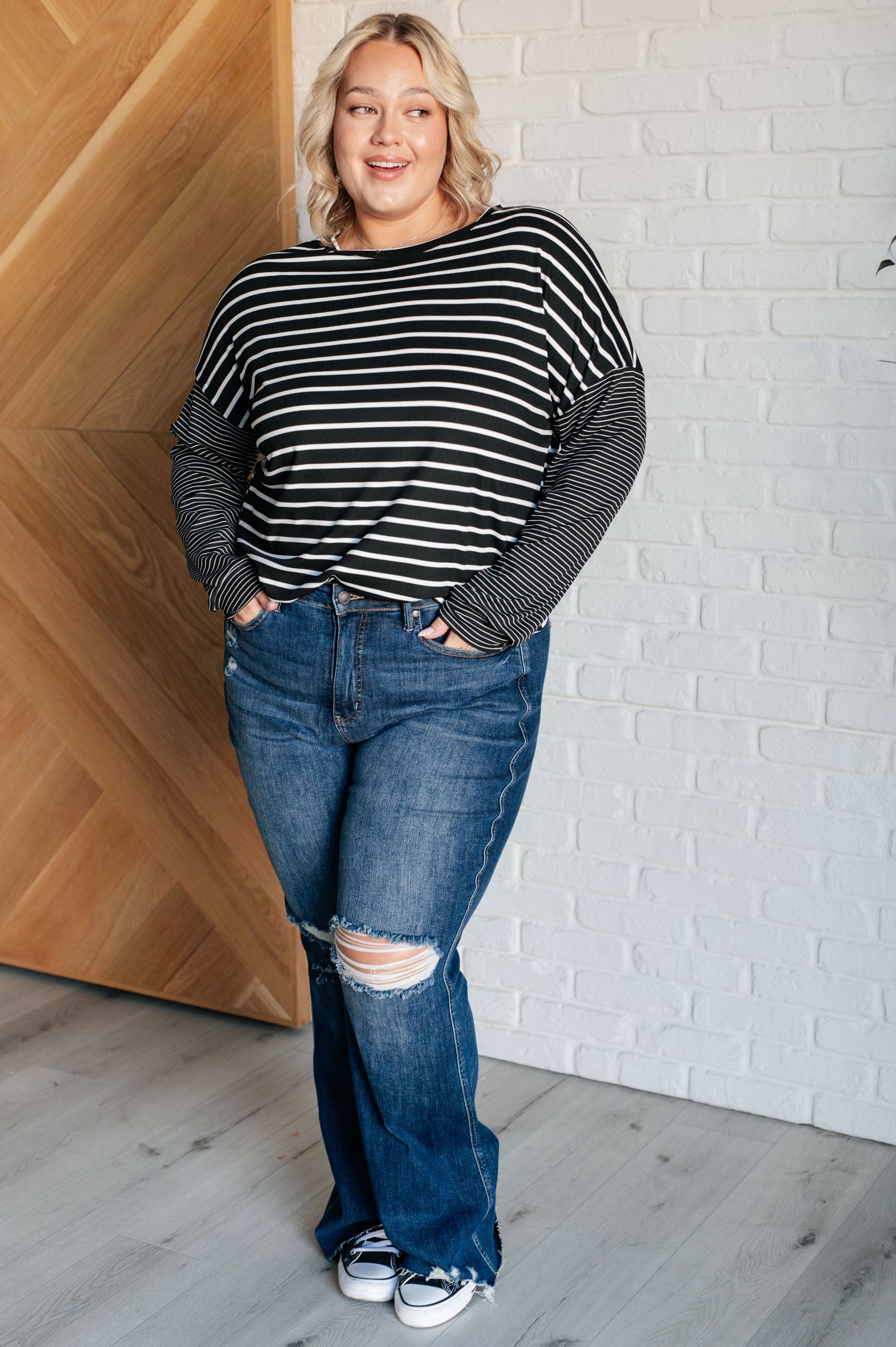 Get playful with this Super Clever Patchwork Striped Top in Black. Its micro ribbed knit provides a cozy, form-fitting feel, while the round neckline and drop shoulder add a touch of casual chic. The banded sleeve cuff gives a unique twist to a timeless design.